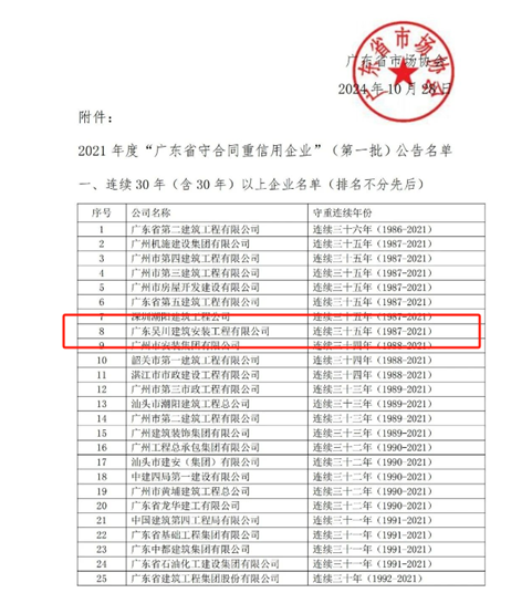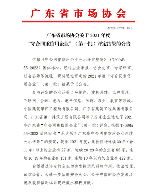 近日,廣東省市場(chǎng)協(xié)會(huì)發(fā)布了2021年度“守合同重信用企業(yè)”(第一批)評(píng)定結(jié)果,我公司榮耀再續(xù),連續(xù)三十五年“廣東省守合同重信用企業(yè)”稱號(hào)。獲得此榮譽(yù),不僅對(duì)公司實(shí)力的認(rèn)可,更是對(duì)誠信經(jīng)營和優(yōu)質(zhì)服務(wù)的肯定。