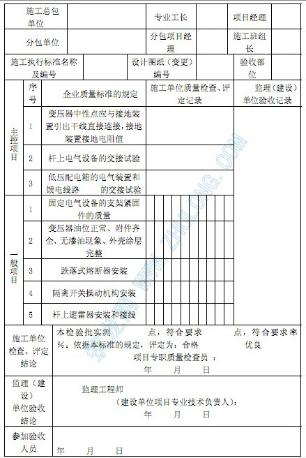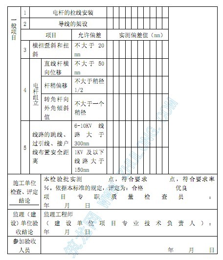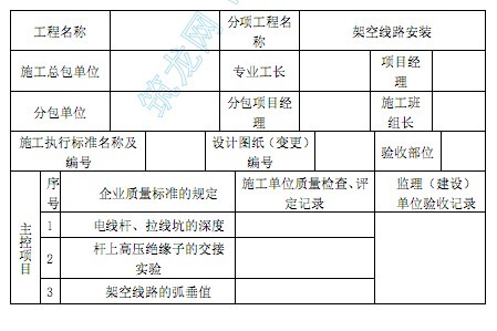 1.1 編制說明 1.1.1 適用范圍 本節(jié)適用于建筑電氣分部工程中室外電氣子分部工程的架空線路及桿上電氣設備 安裝分項工程施工質量的驗收。 1.1.2 分項工程施工質量驗收劃分 本分項工程施工質量驗收標準大量保留國家標準中的有關規(guī)定,將原“架空線路及 桿上電氣設備安裝” 分項工程分解為“架空線路安裝”和“桿上電氣設備安裝”兩部 分,按照兩個類型的檢驗批進行質量驗收。 1.1.3 檢驗批的劃分 檢驗批是工程質量驗收的最小單位,是分項工程及分部(子分部)工程質量驗收的 基礎。 “架空線路安裝”按供電區(qū)段劃分檢驗批; “桿上電氣設備安裝”按供電區(qū)段和庭 院大小、投運時間先后、功能區(qū)段劃分檢驗批。 1.1.4 編制參考標準及規(guī)范 (1) 中建總公司《建筑電氣工程施工工藝標準》 ; (2) 《建筑工程施工質量驗收統(tǒng)一標準》 (GB 50300-2001) ; (3) 《建筑電氣工程施工質量驗收規(guī)范》 (GB 50303-2002) ; (4) 《建筑電氣安裝工程 35KV 及以下架空電力線路施工及及驗收規(guī)范》 (GB 50173) (5) 《電氣裝置安裝工程 電氣設備交接試驗標準》 (GB 50150-91) ; (6) 《供配電系統(tǒng)設計規(guī)范》 (GB 50052-95) ; (7) 《民用建筑電氣設計規(guī)范》 (JGJ/T 16-92) 。 1.2 術語 1.2.1 架空線路 采用桿塔支持電線的,適用于室外的一種線路。 1.2.2 電氣設備 發(fā)電、變電、輸電、配電或用電的任何物件,諸如電機、變壓器、電器、測量儀表、 保護裝置、布線系統(tǒng)的設備、電氣用具。 1.2.3 檢驗批 按同一的生產(chǎn)條件或按規(guī)定的方式匯總起來供檢驗用的,由一定數(shù)量樣本組成的檢 驗體。 1.2.4 保護導體(PE) 為防止發(fā)生電擊危險而與下列部件進行電氣連接的一種導體: ——裸露導電部件; ——外部導電部件; ——主接地端子; ——接地電極(接地裝置) ; ——電源的接地點或人為的中性接點。 1.2.5 驗收 建筑工程在施工單位自行質量檢查評定的基礎上,參與建設活動的有關單位共同 對檢驗批、分項、分部、單位工程的質量進行抽樣復查,根據(jù)相關標準以書面形式對工 程質量達到合格與否做出確認。 1.2.6 主控項目 建筑工程中的對安全、衛(wèi)生、環(huán)境保護和公眾利益起決定性作用的檢驗項目。 1.2.7 一般項目 除主控項目以外的檢驗項目。 1.2.8 抽樣檢驗 按照規(guī)定的抽樣方案,隨機地從進場的材料、構配件、設備或建筑工程檢驗項目中, 按檢驗批抽取一定數(shù)量的樣本所進行的檢驗。 1.2.9 質量控制資料 反映施工過程質量控制的各項工作,可以證明工程內在質量,并與施工同步形成的 技術、管理文件。 1.2.10 電氣裝置 為實現(xiàn)一個或幾個具體目的且特性相配合的電氣設備的組合。 1.3 主控項目 1.3.1 架空線路安裝 1.3.1.1 電桿坑、拉線坑的深度允許偏差,不深于設計坑深 100 ㎜,不淺于設 計坑深 50 ㎜。 1.3.1.2 桿上高壓絕緣子必須按現(xiàn)行國家標準《電氣裝置安裝工程電氣設備交 接試驗標準》GB50150—91 的規(guī)定交接試驗合格。 1.3.1.3 架空導線的弧垂值,允許偏差為設計弧垂值的±5%,水平排列的同檔 導線間弧垂值的偏差為±50 ㎜。 1.3.2 桿上電氣設備安裝 1.3.2.1 變壓器中性點應與接地裝置引出干線直接連接,接地裝置的接地電阻 值必須符合設計要求。 1.3.2.2 桿上變壓器和高壓隔離開關、跌落式熔斷器、避雷器等必須按現(xiàn)行國 家標準《電氣裝置安裝工程電氣設備交接試驗標準》GB50150—91的規(guī)定交接試驗合格。 1.3.2.3 桿上低壓配電箱的電氣裝置和饋電線路交接試驗應符合下列規(guī)定: (1) 每路配電開關及保護裝置的規(guī)格、型號,符合設計要求; (2) 相間和相對地間的絕緣電阻值大于 0.5MΩ; (3) 電氣裝置的交流工頻耐壓試驗電壓為 1KV,當絕緣電阻值大于 10 MΩ時,可 采用 2500V 兆歐表搖測替代,試驗持續(xù)時間 1min,無擊穿閃絡現(xiàn)象。 1.4 一般項目 1.4.1 架空線路安裝 1.4.1.1 拉線的絕緣子及金具應齊全,位置正確,承力拉線應與線路中心線方 向一致,轉角拉線應與線路分角線方向一致。拉線應收緊,收緊程度與桿上導線數(shù)量規(guī) 格及弧垂值相適配。 1.4.1.2 電桿組立應正直,直線桿橫向位移不應大于 50 ㎜,桿稍偏移不應大于 稍徑的 1/2,轉角桿緊線后不向內角傾斜,向外角傾斜不應大于一個稍徑。 1.4.1.3 導線無斷股、扭絞和死彎,與絕緣子固定可靠,金具規(guī)格應與導線規(guī) 格適配。 1.4.1.4 直線桿單橫擔應裝于受電側,終端桿、轉角桿的單橫擔應裝于拉線側。 橫擔的上下歪斜和左右扭斜,從橫擔端部測量不應大于 20 ㎜。橫擔等鍍鋅制品應熱浸 鍍鋅。 1.4.1.5 線路的跳線、過引線、接戶線的線間和線對地間的安全距離,電壓等 級為 6~10 KV的,應大于 300 ㎜;電壓等級為 1 KV 及以下的,應大于150 ㎜。用絕緣 導線架設的線路,絕緣破口處應修補完整。 1.4.2 桿上電氣設備安裝 1.4.2.1 固定電氣設備的支架、緊固件為熱浸鍍鋅制品,緊固件及防松零件齊 全。 1.4.2.2 變壓器油位正常、附件齊全、無滲油現(xiàn)象、外殼涂層完整。 1.4.2.3 桿上隔離開關分、合操動靈活,操動機構機械鎖定可靠,分合時三相 同期性好,分閘后,刀片與靜觸頭間空氣間隙距離不應小于 200 ㎜;地面操作桿與 PE 線連接可靠,且有標識。 1.4.2.4 跌落式熔斷器安裝的相間距離不小于 500 ㎜;熔管試操動能自然打開 旋下。 1.4.2.5 桿